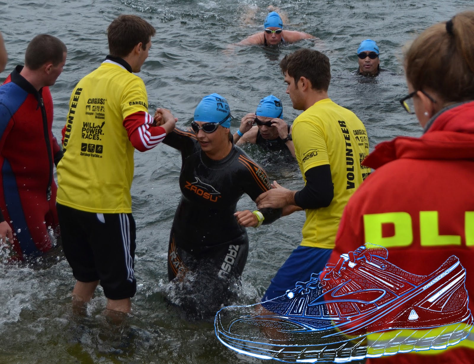 Unsere Athleten auf der Smart-Distanz sollten vor uns auf die Strecke gehen. Es gab also noch eine kurze Einweisung vom Lieblingstrainer und schon verschwanden sie auch schon um sich einzuschwimmen. Wir Olympioniken brachten uns derweil in Anfeuer-Position auf dem Weg vom Wasser in die erste Wechselzone. Mittlerweile hatte es aufgehört zu regnen und Zwischendurch ließ sich sogar die Sonne blicken.