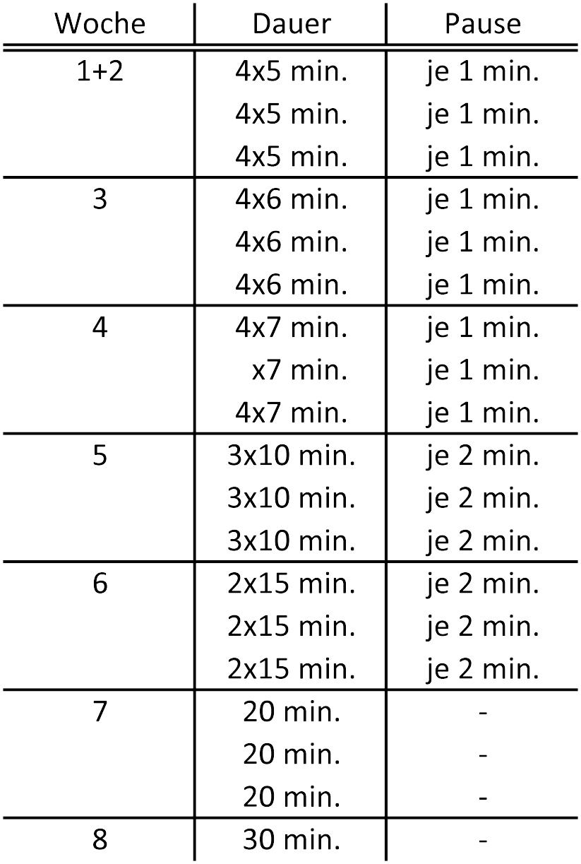 Diesen Plan habe ich mir aus den tausenden Plänen im Internet zusammen gebastelt. Leider haut es so noch nicht so ganz hin: Ich bin jetzt in der zweiten Woche und laufe statt den 4×5 min. 6×5 min., was aber eine enorme Steigerung zu vorher ausmacht.