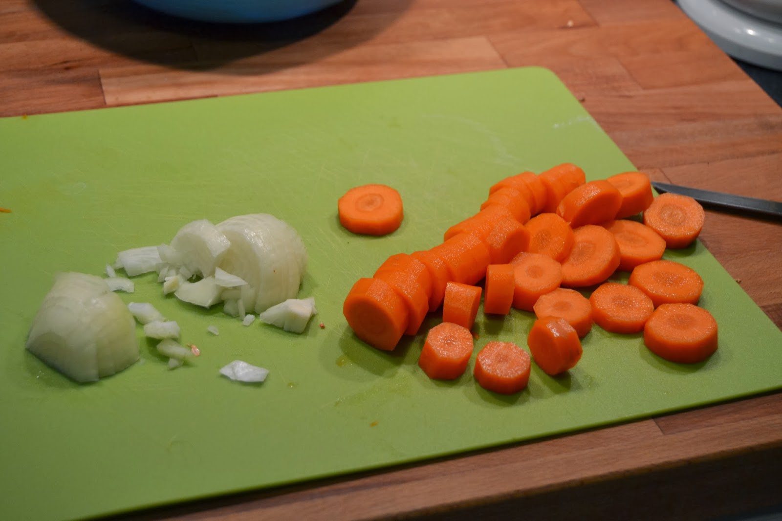 Zuerst müssen die Karotten und die Zwiebel geschält und klein geschnibbelt werden: