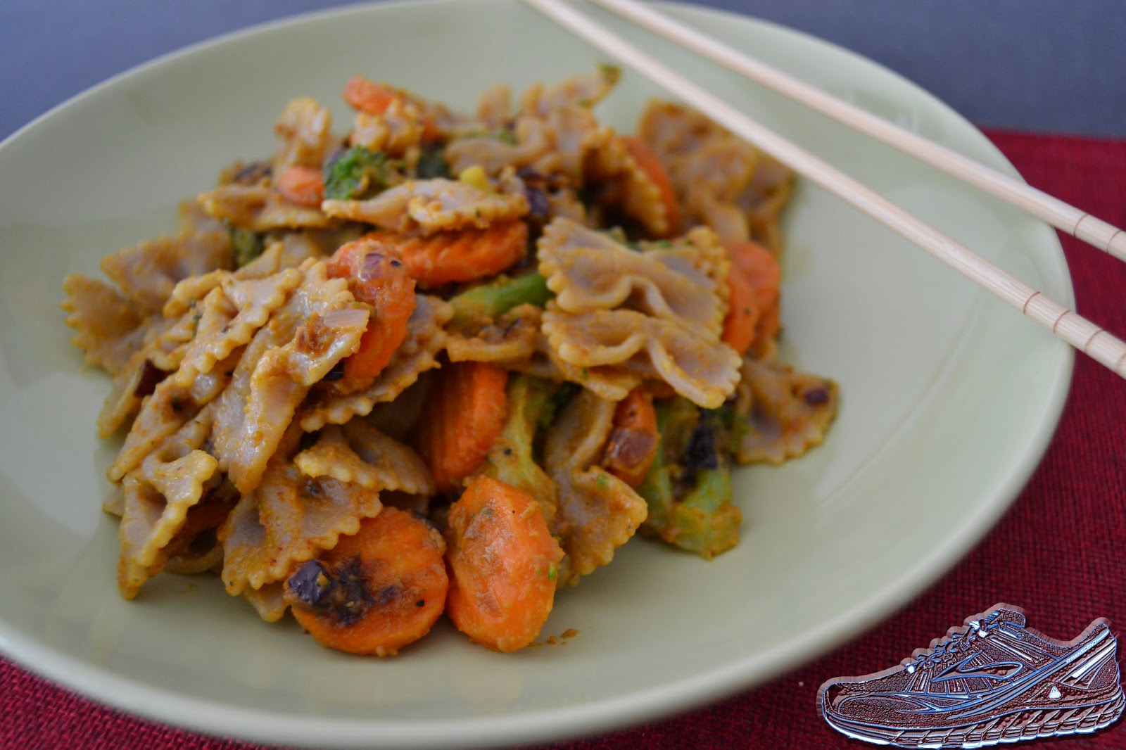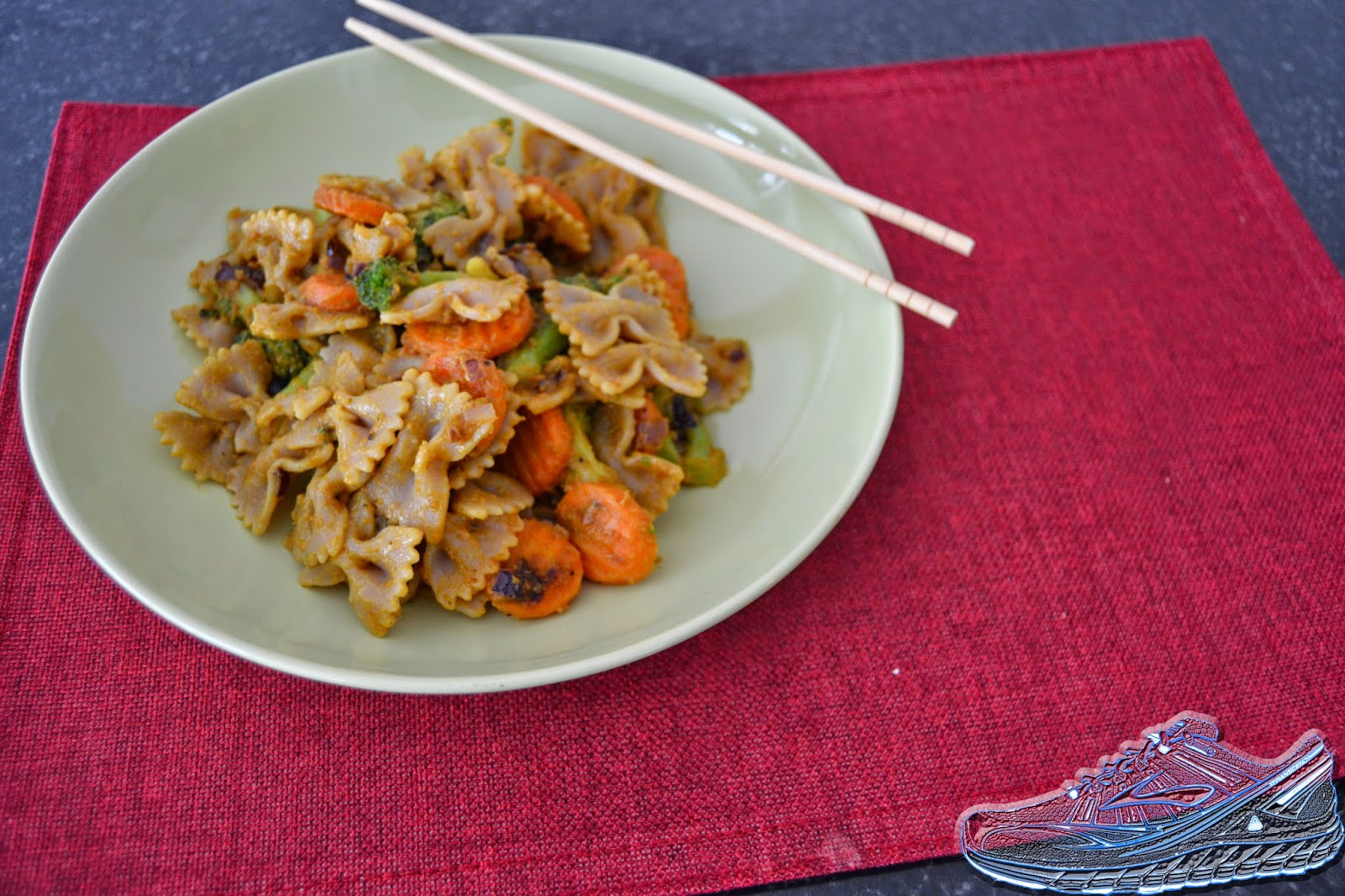 Die Nudeln werden in Salzwasser gekocht. In der Zwischenzeit habe ich aus dem Kaisergemüse den Brokkoli und die Möhren rausgefischt und in der Mikro aufgetaut. Die Zwiebel schnibbeln und zusammen mit etwas Olivenöl anbraten. Dann das Gemüse dazugeben und auch die Gewürze. Die Erdnussbutter habe ich dann nach und nach unter gemischt und alles mit etwas Gemüsebrühe abgelöscht und kurz einkochen lassen. Mit Sojasauce hab ichs dann noch ein bisschen verfeinert. Die fertigen Nudeln habe ich dann auch noch dazu gegeben: